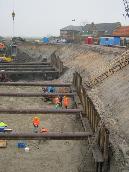 De ‘Sinterklaasstorm’ is inmiddels getemperd, de schade valt mee, de beide hijskranen bij de tunnelkuipen aan de zuidkant van Noordhorn staan al weer overeind. Of ze gebruikt kunnen worden? Af en toe zijn er nog hevige windstoten, verraderlijk. En de buien ‘met winterse neerslag’ liegen er ook niet om! In de buitenlucht werken, in deze tijd van het jaar, heeft een bar karakter…