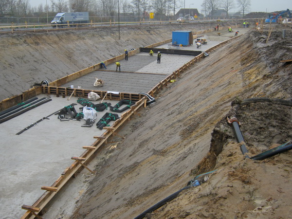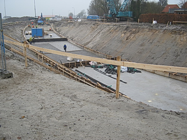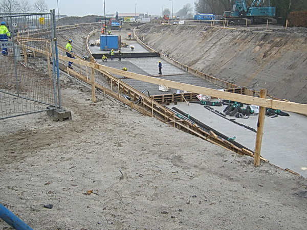 De kuip aan de noordwestkant… Daar zijn de vorderingen al verder… Er ligt een gespoten betonlaag om de oppervlakte betreedbaar te maken… Een deel van de kuip is al dwars bekist en voorzien van ijzerdradenvlechtwerk… Zo wordt het hele tunneloppervlak verdeeld in tien compartimenten en per segment gebouwd. Het wordt steeds spannender…