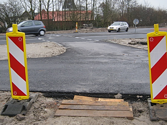 De plaats waar de Mokkenburgweg de Transportweg kruist… Nieuw asfalt op het uitgegraven gedeelte. Maar de rest? Met de vele kuilen en beschadigingen? Wordt dat ook nieuw bestraat? Ik hoop het, maar ik heb zo mijn twijfels… Geen gezicht!