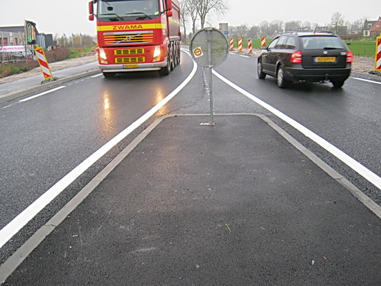Zo kan het prima, zolang de werkzaamheden nog niet helemaal afgerond zijn. Eerst het fietspad over (voert rechts naar de Mokkenburgweg), dan de oversteek over de vernieuwde N355, vlakbij de rotonde. Aan het eind van de oversteek naar de Schippersstraat…