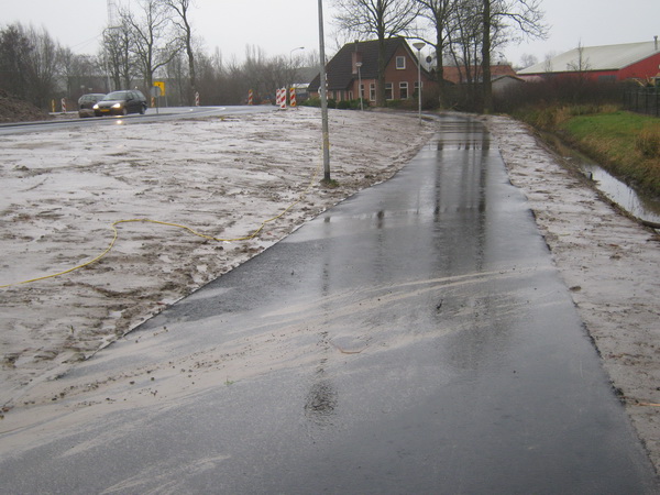 Op de Batavus naar Innovation Systems en het Tuincentrum Frank Meester. Voor alle zekerheid maar via de Industrieweg omgereden, ik wist niet hoe het ervoor stond bij de Schippersstraat. Als ik met fietstassen vol vogelvoer het tuincentrum verlaat, zie ik dat de uitgang bij de N355 open is… Kijken! Dat moet lukken, richting Schippersstraat. Kan ik meteen wat kiekjes maken… Het laatste stuk dichtbij het einde van de Schippersstraat is ‘een glibberboel’ (al viel het me nog mee…) Daar had ook wel een plaat kunnen liggen, of wat stukken hout… Ik denk dat de projectleiders niet altijd beseffen hoe belangrijk zo’n toegangsweg voor vele dorpelingen is naar de bedrijven aan de Handelsweg, juist in deze weken. Soms kan het net even iets toeschietelijker…