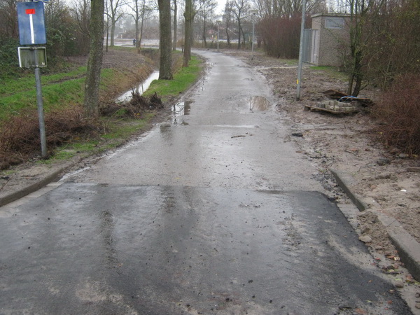 Meteen doorgelopen richting de Mokkenburgweg. Een natte boel! Als dat maar goed gaat, wanneer er werkelijk sprake is van grote hoeveelheden hemelwater… Je kunt wel proefondervindelijk te weten komen hoe de waterstromen lopen…