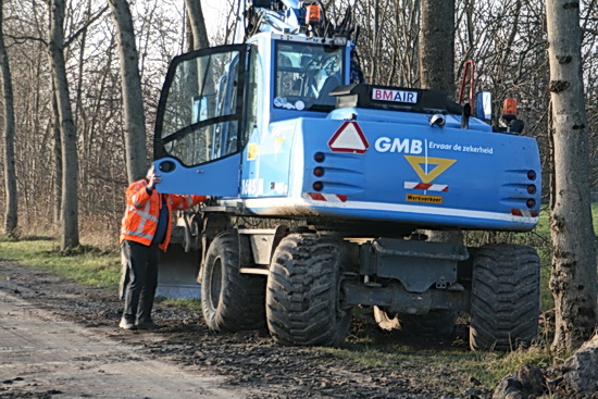 Weerzien met ‘de blauwe kapitein’ (erenaam geschonken door watcher Jan Thijs de H.) en zijn prachtige GMB-machine! De kraanmachinist is juist teruggebracht door teamleider Kees Kranenburg (“Wil je een dropje?” “Ja, graag!”) en gaat nu aan de slag met zijn gewillige grijper.