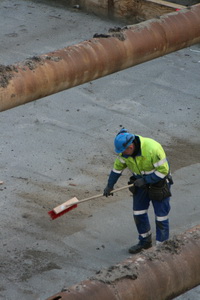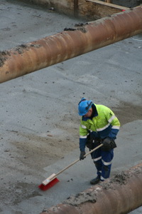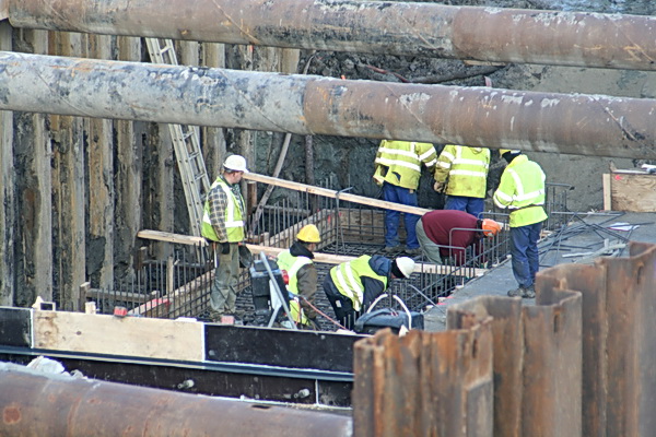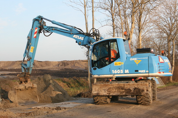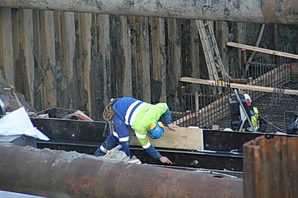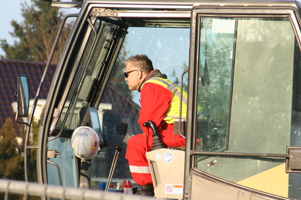 Aan de wegkant wordt ook nog intensief geklust. Dat moet inderdaad goed worden geregeld, omdat dit oostelijke deel eerst wordt afgebouwd. Dan de weg van Noordhorn naar de brug terugleggen over het spiksplinternieuwe tunneldeel… En dan wordt het middendeel weggegraven en tot volwaardig tunneldeel getransformeerd. Een ingewikkeld proces, maar ze zijn voor geen kleintje vervaard, deze GMB-jongens… (Merkwaardig dat er zo weinig vrouwen werken!!)
