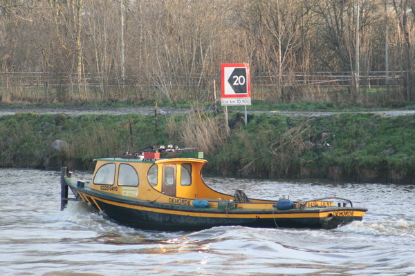 Nee, hiervoor hoeft de brug niet omhoog, een voorbijschietend KNOLvaartuig in de huiskleuren van de onderneming uit Akkrum! Op weg naar de heiplaats? “De Horde”… Kan maar beter uit de buurt blijven….