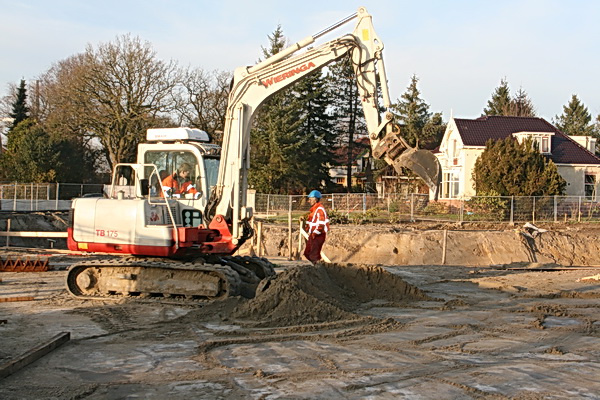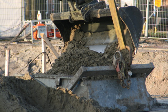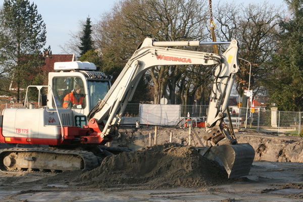 Bij het tunnelterrein oost is de grijsrode grijper van Wieringa (Bedum) teruggekeerd op de aardbodem, weer nuchter met beide rupsbanden op de grond. Eigen zandbult afgegraven? De laatste happen zand gaan via het inmiddels befaamde “bakje” naar beneden, onderin de tunnelkuip…