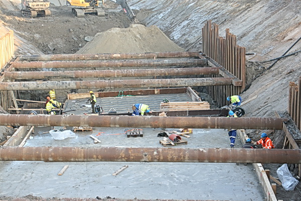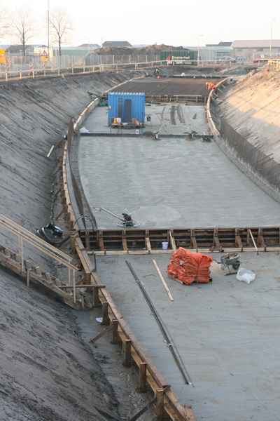 Het totaaloverzicht van het oostelijke tunneldeel. Achteraan de Volvograver die in de komende werkdagen de tunnelhelling vorm geeft. In de tunnelkuip de ijzervlechters, de GMB-technici, mannen van Mulder……