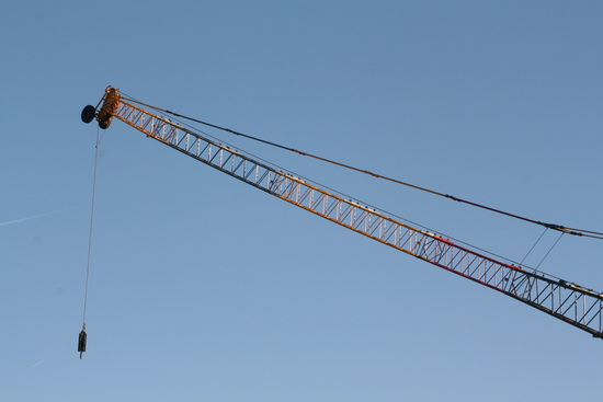De kraanmachinist is nog niet naar huis…. Hij laat de giek van de reuzenkraan een fikse buiging maken… Hoe moet dat met die takel?
