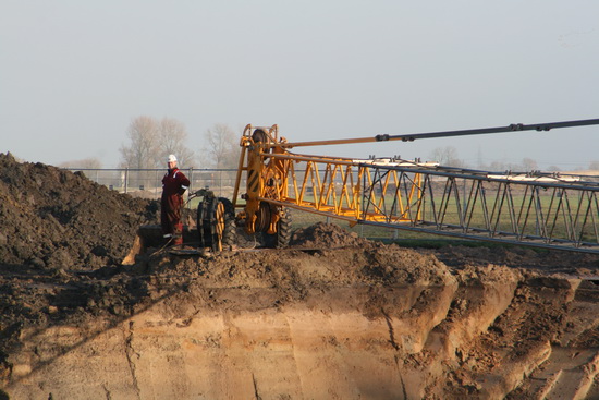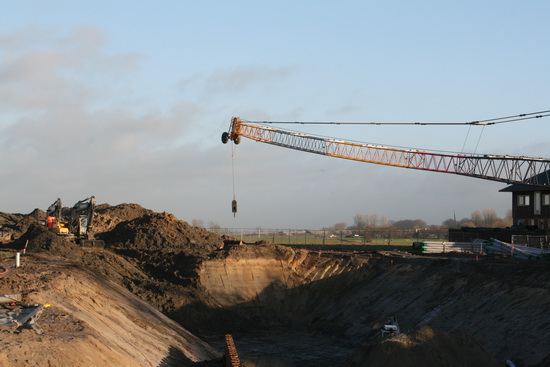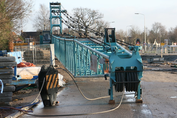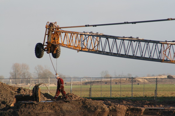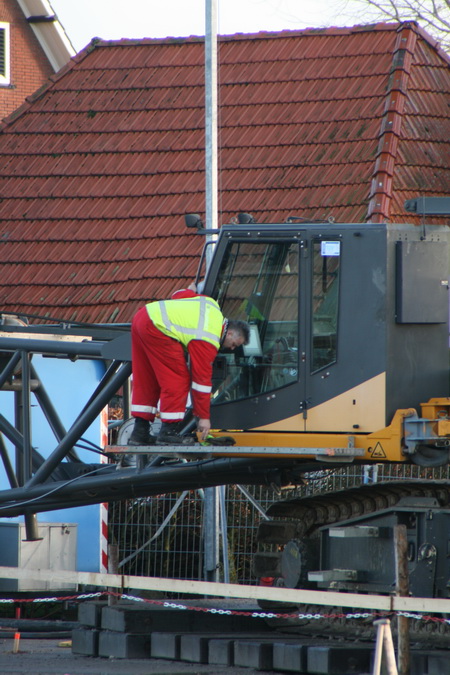 De assistent is nog bezig met de zachte landing van de giek, geeft aanwijzingen aan de kraanmachinist. Goed dat het weer enigszins opgeklaard is, zichtbaar!