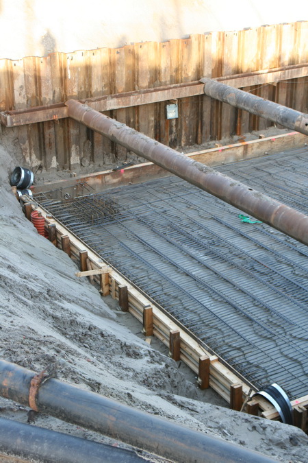 De westkant van de tunnelkuip oost… Een flinke bekisting, ook parallel aan de weg. En die brede band, leidingen? Hoe gaat dat verder naar boven??!