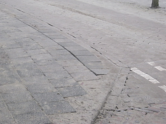 Deze foto is van zondag 15/12…. De tegelrand tegen de weg aan ligt al weer los, en scheef… Daar is wat zwaars overheen gegaan, waartegen de nieuwe bestrating niet echt bestand bleek…..
