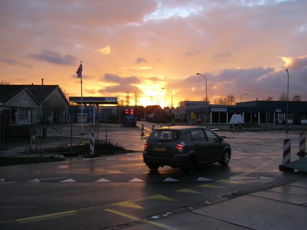 De ingewikkelde kruising van de Industrieweg/Langestraat met de N355, vlak bij de plek waar de tunnel wordt gebouwd. (Met de rug er naar toe…) Links het gebouw van Bé-JO dat wordt gesloopt t.z.t. In het tweede deel van het semi-permanente gebouw zit de GMB met zijn kantoorwerkers en met een soort kantineruimte voor de handwerkers. Rechts aan de overkant Fysio Fit, daarvoor garagebedrijf Smids. Zon onder…..