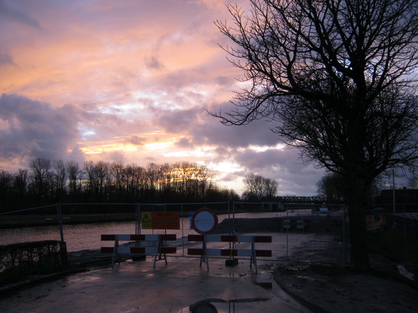 Hier is de zonsondergang nog weer anders…. En de stremming van de kanaalweg noord bij Koopman Transport nog steeds hetzelfde…. Vanwaar deze status quo? Irritant dat de weg nog steeds niet kan worden gebruikt.