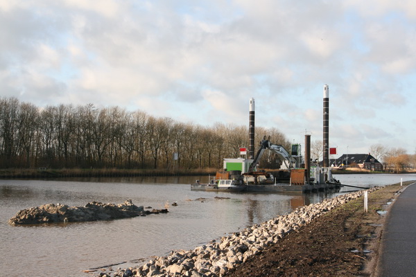 Een recente foto, genomen aan de westkant van de spoorbrug in de laatste week van december 2013. In het Van Starkenborghkanaal ligt het werkeiland van Martens en Van Oord (Oosterhout) in alle rust de jaarwisseling te verbeiden. Vanaf 6 januari a.s. zal het hier ook weer gonzen van de activiteit, herstart baggerwerkzaamheden. Op de achtergrond de zuidkant van Noordhorner Tolhek, de plek waar het Hoendiep uitmondt in het Van Starkenborghkanaal. De kenmerkende boerderij staat er nog, ook de vroegere brugwachterswoning.