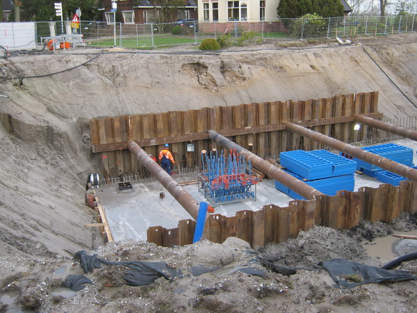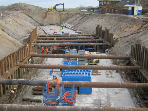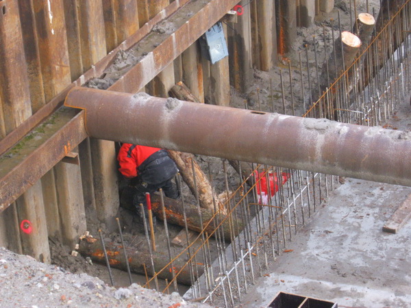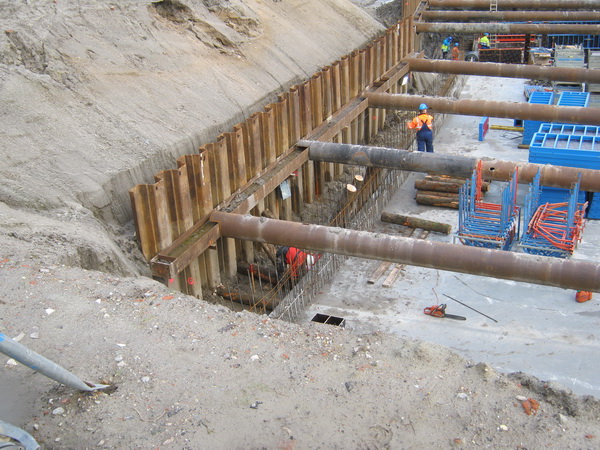 Nu ook vooraan in dit tunneldeel oost drukke werkzaamheden. Er worden boomstamdelen als stut aangebracht. Achter de ijzeren platen lijkt de zandrug in beweging te zijn gekomen. Invloed van de recente regenbuien?