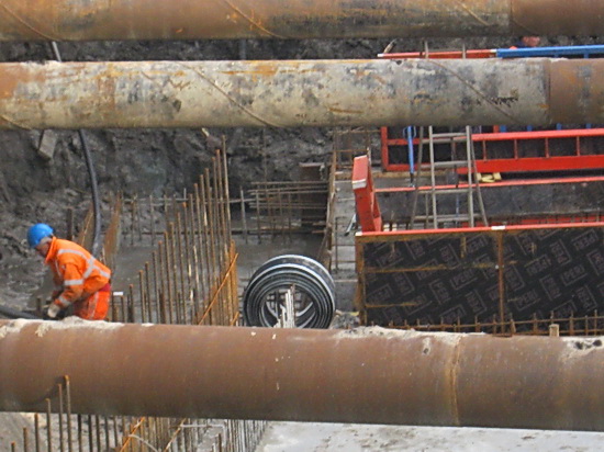 Bij de beide tunnelkuipen aan weerskanten van de verbinding van de Langestraat met de N355 en de Industrieweg, was het vandaag (nog) drukker dan gisteren. Met forse stukken boomstam wordt de noordelijke wand gestut, van belang neem ik aan voor de opbouw van de tunnelmuur aan die kant. Achterin bij de waterkelders ook volop werkzaamheid (ook de mini-grijper wordt via de hijskraan neergelaten, er is nog iets te graven op de vierkante meter….)