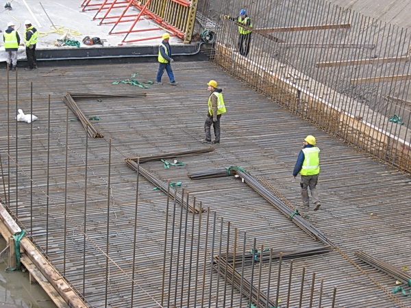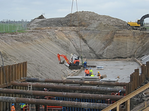 Ingezoomd op de waterkelders, links de pompkelder waar een oude bekende in oranje dracht aan het werk is. Rechts wanddelen? Vloerdelen? Plafonddelen?