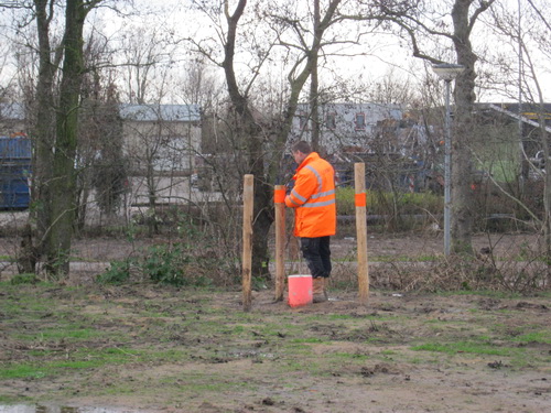 Een meetkundig geschoolde orangist brengt dito gekleurde banden aan rond de drie paaltjes die beschermend rond het rose gekleurde meetpunt staan opgesteld. Wat is de betekenis….? Dit is een ijkpunt, een vast punt, er zijn er meer rond de bouwputten. Geven houvast bij het heel nauwkeurig uitvoeren van de bouwplannen.