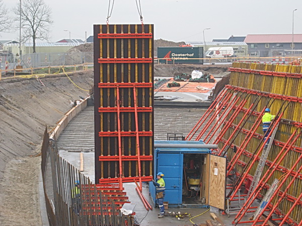 Een bekistingswand wordt per hijskraan naar de plaats van bestemming gebracht, aan de westkant van het noordwestelijke tunneldeel.