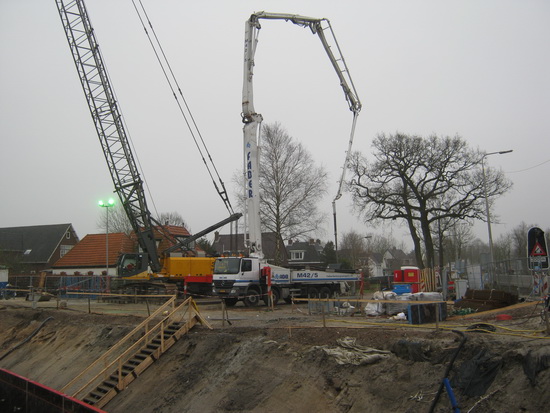 Daar staat ie, de betonpomp, uitgewerkt voor dit moment. Hij zal nog meermalen acte de présence geven, de komende weken!