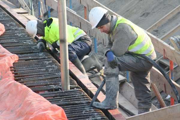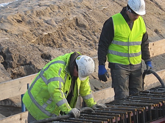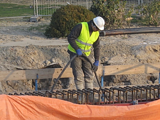 Belangrijke taak voor deze betonstortbegeleider, zorgen dat het gestorte beton goed doorzakt naar onderen, een massief geheel wordt, zonder luchtbellen. Hoe ging dat ook al weer? Met behulp van warme lucht?