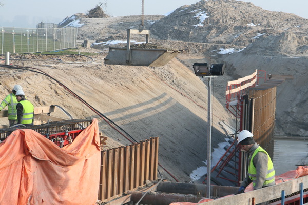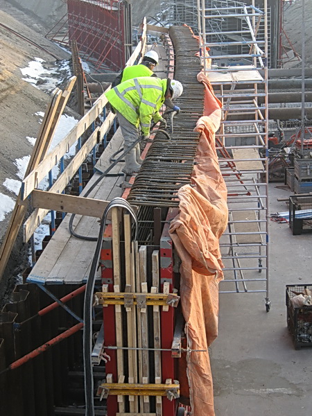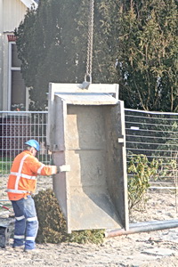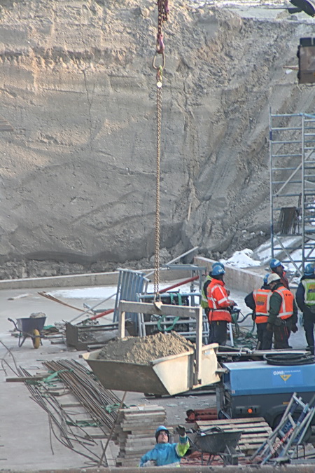 Terwijl de bak met speciaal zand door de lucht zweeft richting bestemming, gaan de betonstortbegeleiders op beide wanden onverdroten verder met hun stort- en luchtbellenpreventie-activiteit. Even kiekpauze, vervolg via deel 3, op deze zender! (Pardon, op deze weblog!)