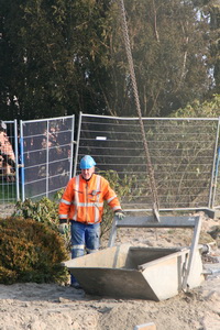 Daar de betonpomp en de betonauto’s de ruimte aan de zuidkant benutten, wordt het speciale zand via de noordkant naar de juiste tunnelplek vervoerd met behulp van de grote hijskraan. Daarvoor wordt deze bak ingeschakeld. Getemd! (En de conifeer van Kruizinga leeft nog…)