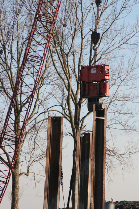 Aan de zuidkant van de NVH-brug-bouwput worden nog steeds metalen wanden de grond in gedreven, gedrukt, geslagen, getrild…… Dat wordt een stevige damwandkuip, 7 meter 20 diep….