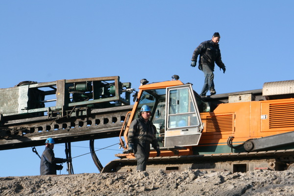 Werkoverleg tussen de twee KNOL-techneuten die de problemen met de hei-installatie dienen op te lossen. Niet zo simpel blijkbaar… (Volgens mij zit de machinist zich in zijn cabine te verbijten….)