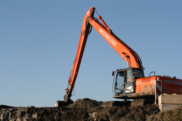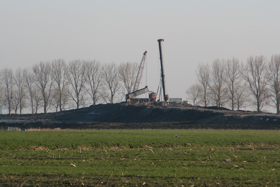 Kiek vanaf het tijdelijke asfaltpad (bypass voor fietsers en wandelaars). Twee grijpers van Martens en Van Oord. De ene op de wal, de andere op een schip. Dubbele ontschepingscapaciteit. Zelfs ’s avonds wordt er af en toe doorgewerkt, blijkbaar is hierbij enige haast geboden. Natuurlijk moet het nieuwe traject nog geruime tijd roerloos liggen, de grond moet ‘inklinken’…… (Heb ik gehoord….)