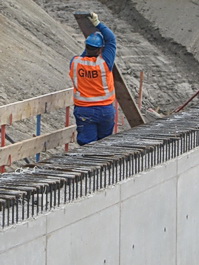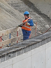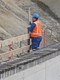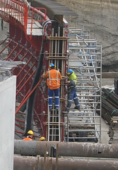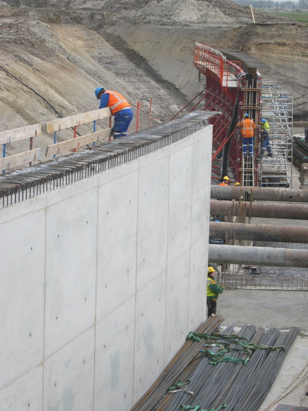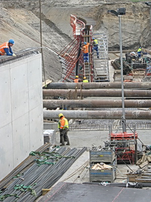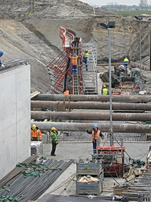 De van bekisting ontdane noordwand (binnenkant) met bovenop een bekende GMB’er die de wand van niet meer noodzakelijke attributen ontdoet. Op de grond de vele staaldraden die worden gebruikt voor de bewapening van de tunnelvloer bovenop het keldergedeelte.