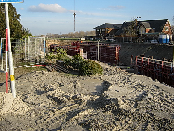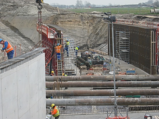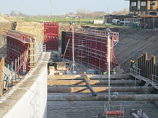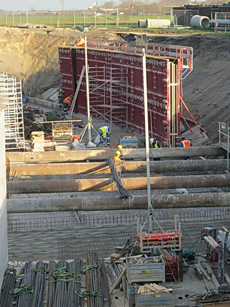 Overzicht van de tunnelkuip aan de oostkant, de segmenten 4, 3, 2, 1…. Op de grond in de tunnelkuip een aantal bekistingspanelen, grondig gereinigd en geolied (met dank aan de informatie van Fré Bisschop, zie www.noordhorntoenennu.com ), blijft er geen beton aan zitten…. De panelen op de grond worden achteraan rechts hergebruikt.