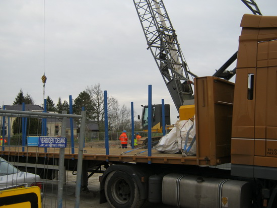 Met behulp van de super hijskraan is er net een baal materiaal afgeleverd, vlak achter de linkerwand…. Zo’n hijskraan is in dit soort situaties echt onmisbaar….