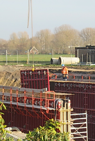 Nou gaat het door, de bekisting van het laatste open wandgedeelte wordt voltooid. Bij de steunbuizen het keldergedeelte waar steeds meer wordt bewapend.