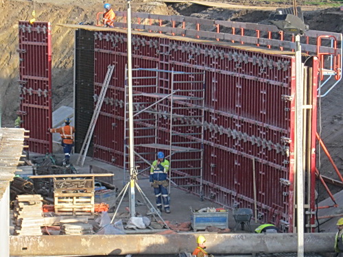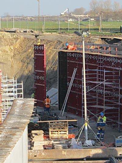 Net op tijd om nog een glimp op te vangen van het transporteren van het laatste bekistingspaneel naar de tunnelmuur achteraan rechts….