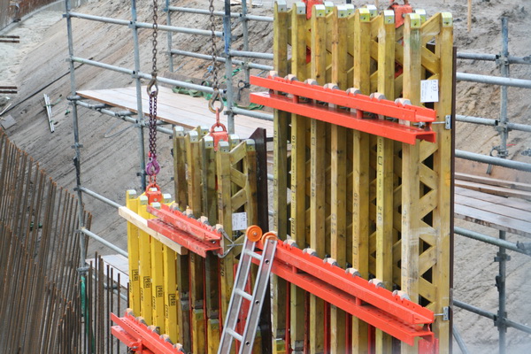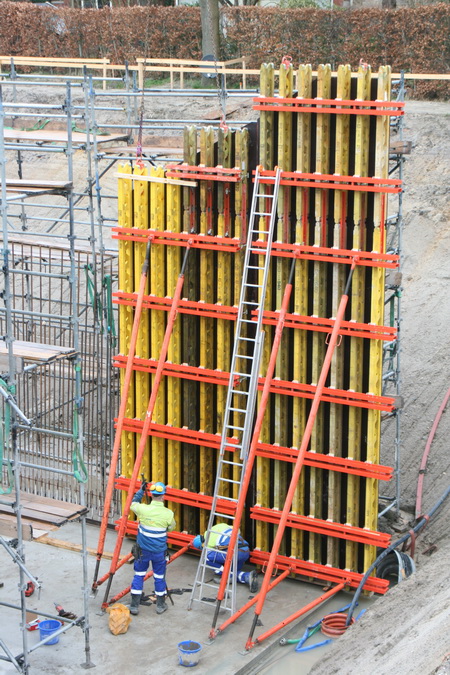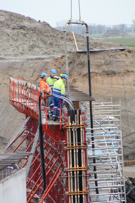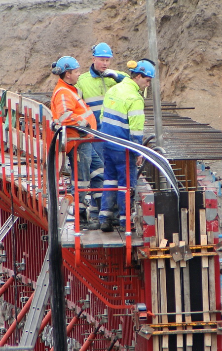 Aha, hier is het duidelijker te zien! De slang zit boven vast aan een gebogen buis waarmee het beton tussen de bekisting wordt gedeponeerd. Een man voor de betongeleiding, de andere twee voor de trilnaalden…… Alhoewel, drie gehelmde werknemers bovenop de muur, maar……. WAAR IS HET BETON???!