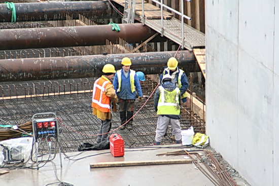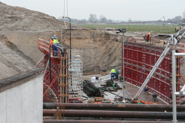 Zo ziet het overzicht eruit. Links de muur met de drie werkers die tot nietsdoen zijn veroordeeld, voor ‘even’…. Rechts de muur die nog aan de beurt komt. Daartussen de betonpomp-‘slurf’, gekoppeld aan de zwarte slang, die dichterbij de te storten muur steil omhoog gaat, enz.