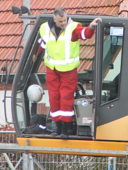 Uitvergroot, een kraanmachinist op sokken…. Moeten daar ook pedalen worden bediend?