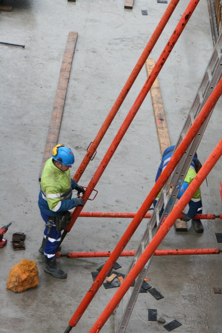 Nemen we een kijkje bij de overburen, aan de noordwestkant. (Voor mij) onduidelijke werkzaamheden…. Twee vloerwerkers samenwerkend met de kraanmachinist (noordwest). Wat is dit voor bouwsel?