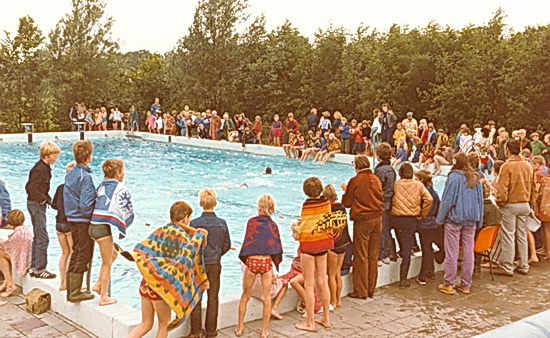 Schoolzwemwedstrijden, eens per jaar, in het diepe bad van “De Dobbe”. Vele supporters langs de kant, ook uit Noordhorn.