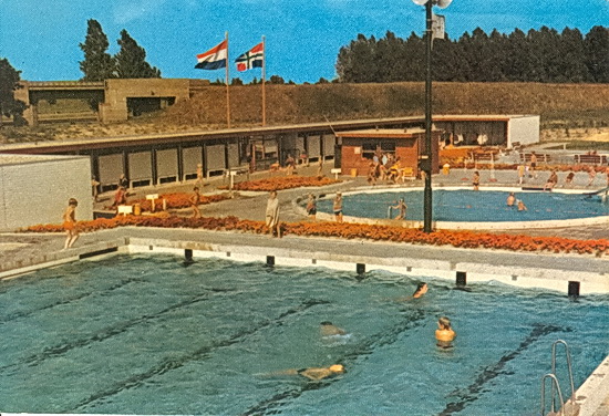 Foto, van west naar oost, van een deel van het nieuwe zwembad “De Dobbe”, genoemd naar de ronde vorm van het kinderbad.
