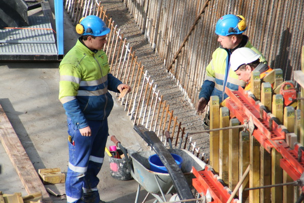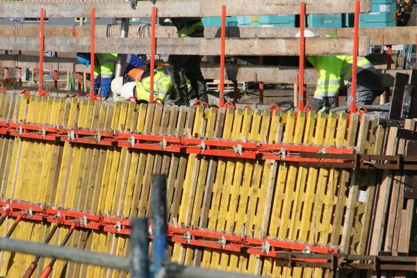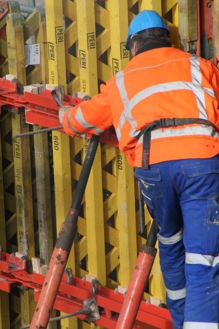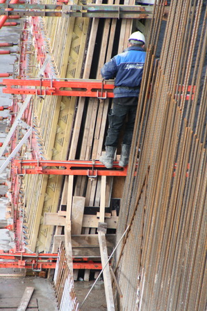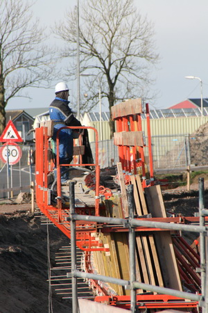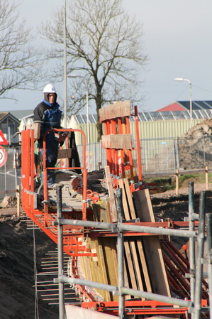 Hier wordt gesleuteld aan de bekisting van de rechte wand, dichterbij de afslag naar het dorp, ja, de wand die trapsgewijs afloopt. Het zit ingenieus in elkaar! Hier wat aandraaien, daar iets in steken, of uit halen….