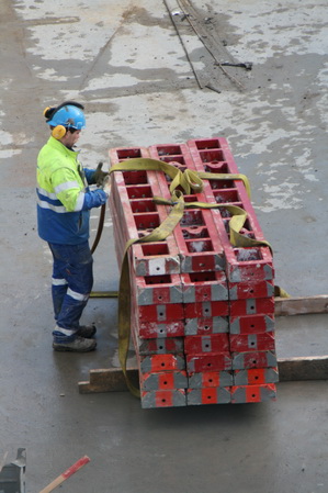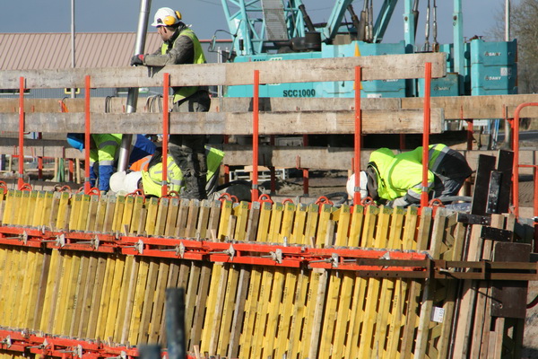 Links werk in de tunnelbak aan de noordwestkant, rechts het klaarmaken van een pakket met bekistingsonderdelen in de kuip aan de oostkant. Verzending per super kraan, hier komt PostNL niet aan te pas….