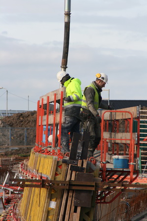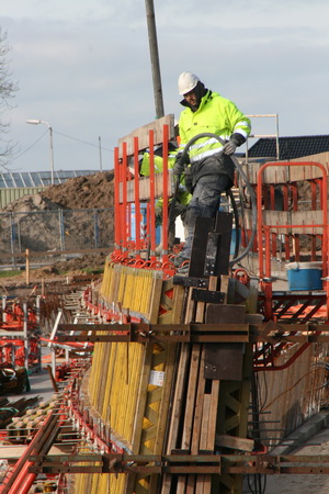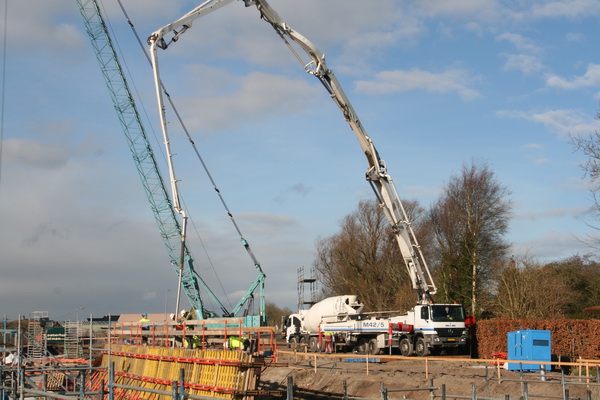 Dit is inderdaad ‘het verband’, de structuur, het overzicht…. Rechts de betonpomp met leverende betonauto, de arm die naar de schuine oostelijke wand is geleid en daar beton ‘loost’, de werkers die de arm begeleiden, en de trilnaalden, om luchtbelvorming tegen te gaan….
