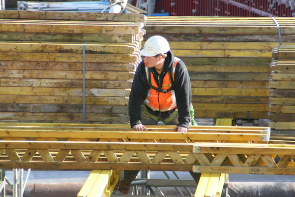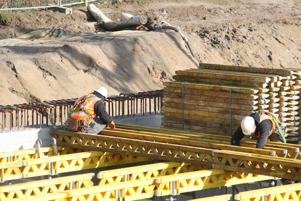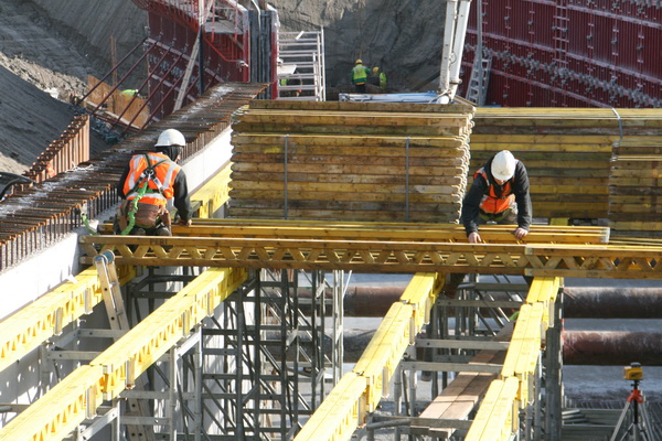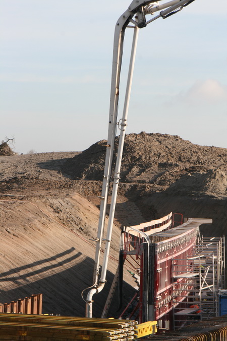 De arm van de betonpomp verdwijnt achter de dakconstructie van moot 4. Het beton is voor moot 3, vloer/plafond van het keldergedeelte. (Plafond van de waterkelder, vloer van de tunnel…)