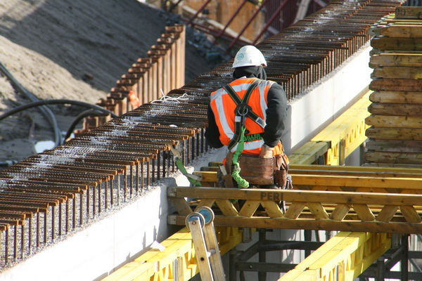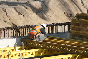 De betonmeester die het stuurkastje ‘bespeelt’ en daarmee bepaalt of de arm van de betonpomp beton ‘spuwt’… Beetje troosteloze omgeving, daar bovengronds aan de zuidkant van de tunnelkuip, maar daar heeft deze medewerker weinig oog voor.