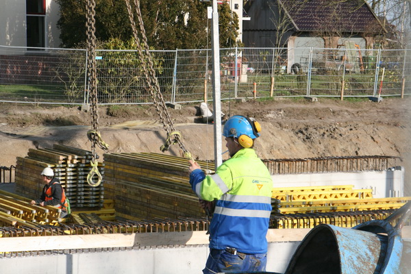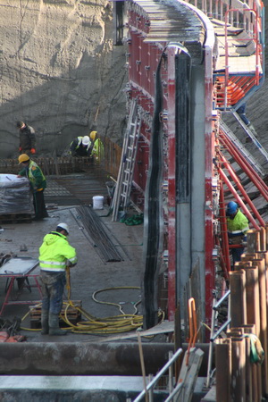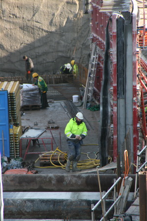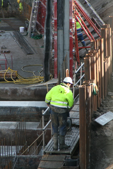 Boeiende foto! Door de telelenswerking wordt de plaat als het ware ‘verdicht’… Op de voorgrond bij de steunbuizen het keldergedeelte (moot 3) dat wordt voorzien van een betonvloer/plafond. Voorbij de werker in het gele jack is moot 2, waarvan beide wanden al zijn volgestort met beton. De bekisting moet nog worden verwijderd, maar misschien wordt daar bewust mee gewacht tot diezelfde bekisting bij andere wanden kan worden gebruikt. Daarachter de wapening in moot 1, de tunnelvloer zal komende donderdag worden gestort als alles volgens plan verloopt.