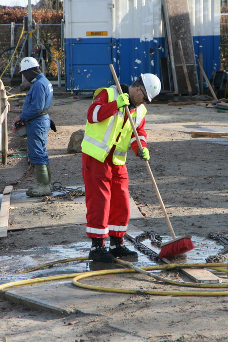 Alternatieve klus voor de kraancommandant, het hanteren van de bezem en kraanwater. De kettingen worden schoongemaakt, het weekeinde voorbereid.