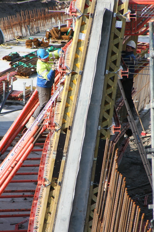Een kijkje genomen aan de noordwestkant, bij de schuine wand van moot 7, waar aan weerskanten op hoog niveau wordt gewerkt. Wat er precies gebeurt? Geen idee….