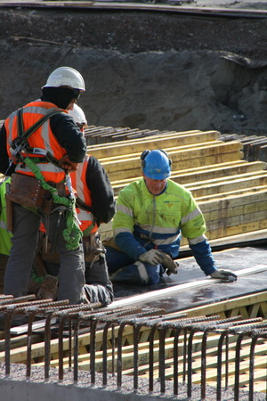 Dan maar terug naar de tunnelkuip oost… De dakconstructeurs die een geelgroen gejackte collega ‘uit het zicht’ houden… (Hij wil niet op de foto, een excuus klinkend als “Ik word gezocht…”)